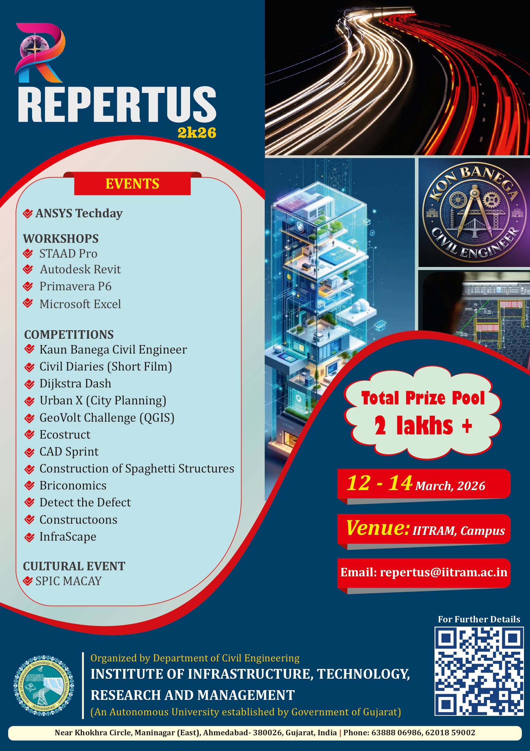 Repertus2k26 is the national-level Civil Engineering Tech Fest of IITRAM, Ahmedabad, a three-day celebration of innovation, technology, and creativity