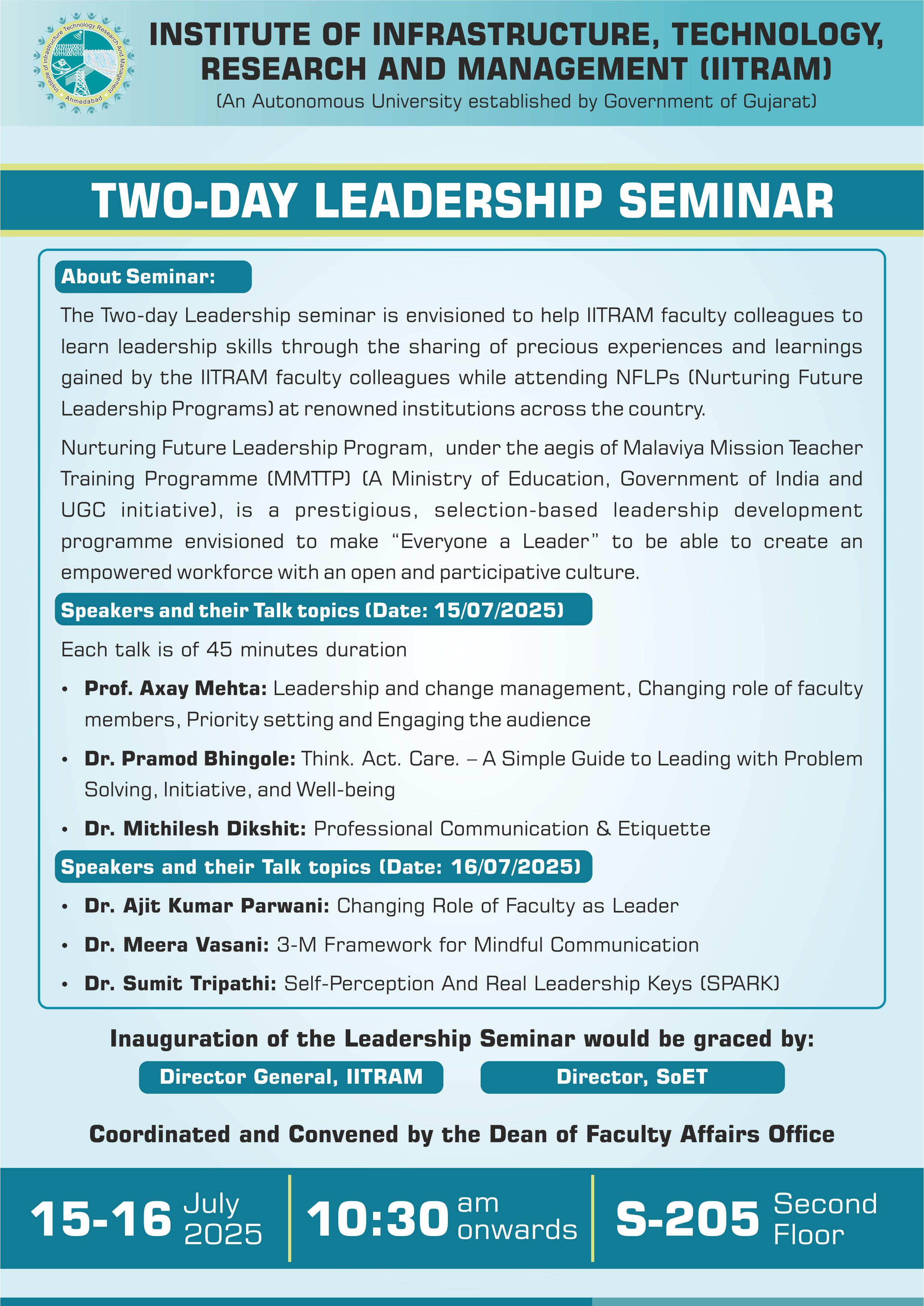 Nurturing Future Leadership Program, under the aegis of Malaviya Mission Teacher Training Programme (MMTTP) (A Ministry of Education, Government of India, and UGC initiative), is a prestigious, selection-based leadership development programme envisioned to make “Everyone a Leader” to be able to create an empowered workforce with an open and participative culture. The program was funded by the Ministry of Education, Government of India. The mission of MOE, GOI and UGC is to make "Everyone a leader" but all the faculty colleagues were not able to attend the NFLP due to constraints. In this direction a Two-day Leadership seminar (15 -16, July 2025) is envisioned to help IITRAM faculty colleagues to learn leadership skills through the sharing of the precious experiences and learnings gained by the 6 IITRAM faculty colleagues while attending NFLP programs at renowned institutions across the country.