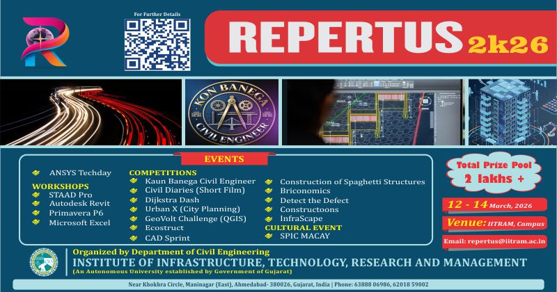Repertus2k26 is the national-level Civil Engineering Tech Fest of IITRAM, Ahmedabad, a three-day celebration of innovation, technology, and creativity