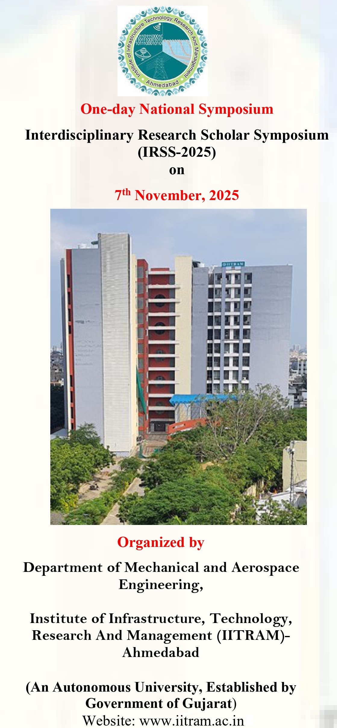 The Interdisciplinary Research Scholar Symposium 2025, organized by the Department of Mechanical and Aerospace Engineering at IITRAM, is a one-day event designed to foster students a dedicated platform to showcase their ideas and findings through paper presentations based on the conference theme. This symposium aims to bring together bright minds to present and discuss cutting-edge research, addressing real-world challenges through interdisciplinary approaches. The symposium will benefit society by promoting sustainable and innovative technical solutions that address critical issues such as infrastructure development, environmental conservation, and energy efficiency. This event will inspire young researchers to contribute meaningfully to technological advancements and societal progress.